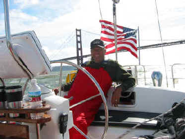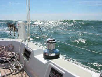 Bridge, we surfed in on waves (far right). Mike sails us under the